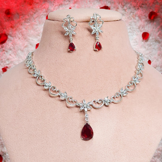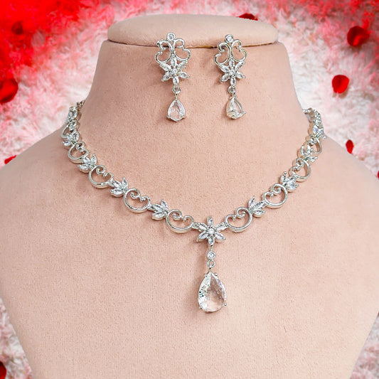 Rhodium Plated Silver Toned Elegant American Diamond Studded Necklace with Earring Jewellery Set