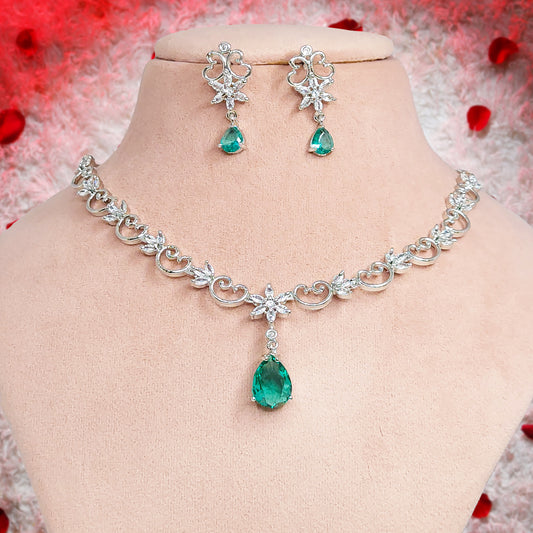 Rhodium Plated Silver Toned Mint Green American Diamond Studded Necklace with Earring Jewellery Set