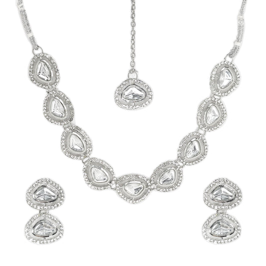 Silver Plated Stunning Kundan Austrian Diamond Necklace Jewellery Set with Maang Tikka